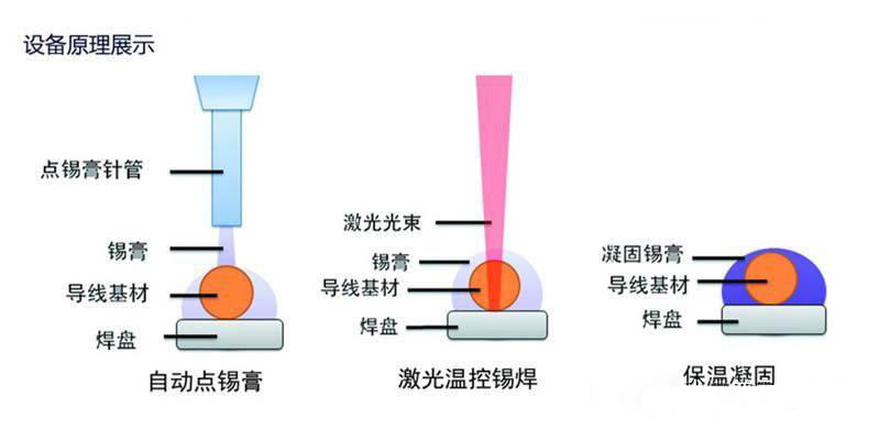 激光錫焊技術(shù)是用精確聚焦的激光束光點照射焊盤區(qū)域。吸收激光能量后,焊接區(qū)域迅速升溫熔化焊料,然后停止激光照射冷卻焊接區(qū)域,使焊料凝固,形成焊點。由于只局部加熱焊接區(qū)域,整個部件的其他部分幾乎不受加熱的影響,激光照射時間通常只有幾百毫秒。非接觸焊接對焊盤沒有機械應(yīng)力影響,空間利用率較高。