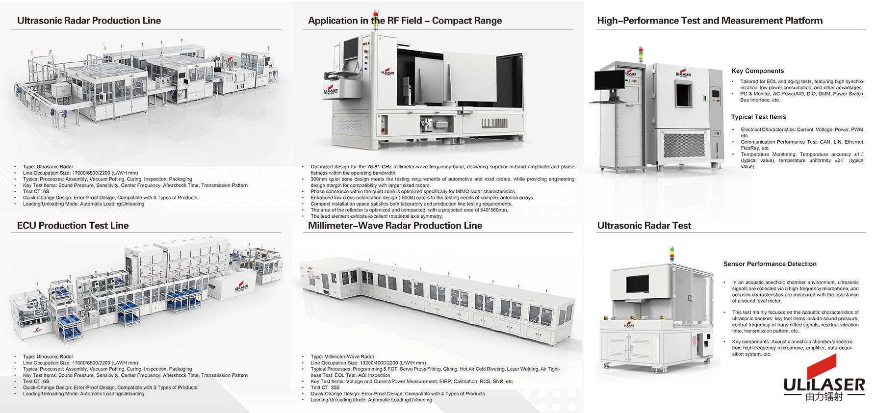 在由力鐳射的展位上,一套完整的ADAS(高階駕駛輔助系統(tǒng))一站式解決方案成為絕對主角,從核心控制單元到傳感器產(chǎn)線,再到專業(yè)測試設(shè)備,全方位展現(xiàn)了中國企業(yè)在智能駕駛領(lǐng)域的硬實力。其中,作為ADAS“大腦”的域控制器,憑借高集成度、強算力的優(yōu)勢,可實現(xiàn)多傳感器數(shù)據(jù)融合與精準(zhǔn)決策,為智能駕駛提供穩(wěn)定可靠的核心支撐;毫米波雷達產(chǎn)線與激光雷達產(chǎn)線則展示了從核心部件研發(fā)到規(guī)?;a(chǎn)的全能力,兩條產(chǎn)線均采用自動化生產(chǎn)技術(shù),確保了傳感器產(chǎn)品的一致性與穩(wěn)定性,適配不同級別智能駕駛車型需求;而超聲波雷達測試暗箱與緊縮場測試系統(tǒng),更是填補了不少企業(yè)在傳感器精準(zhǔn)測試領(lǐng)域的需求空白,前者能模擬復(fù)雜環(huán)境下的雷達性能測試,后者則為毫米波雷達等提供高精度的電磁環(huán)境測試,助力企業(yè)大幅提升產(chǎn)品研發(fā)效率。