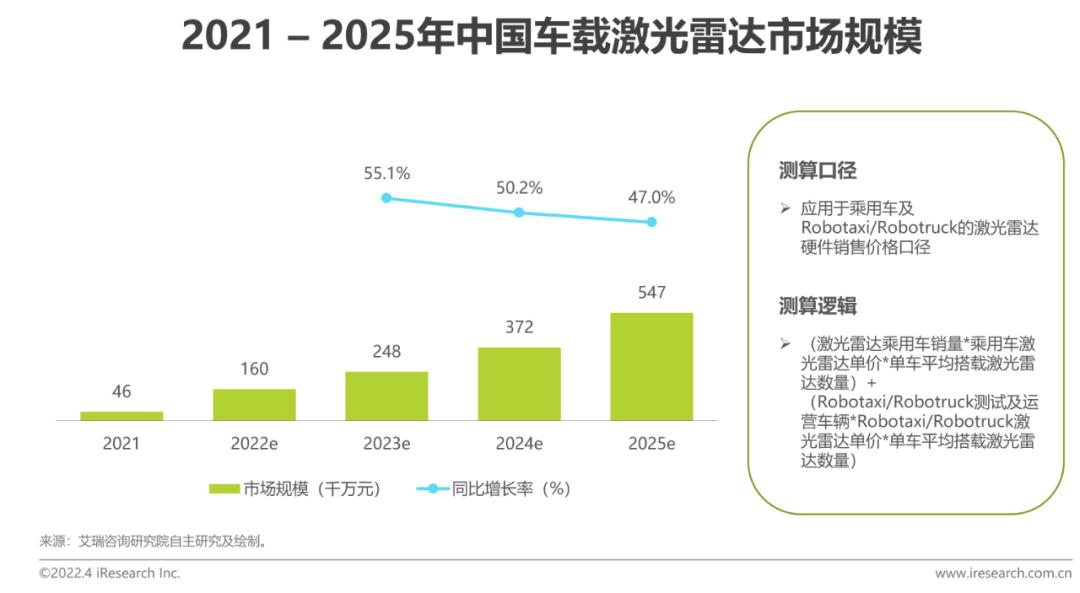 ?隨著輔助駕駛功能的逐漸量產(chǎn),乘用車輔助駕駛系統(tǒng)已經(jīng)成為行業(yè)標(biāo)準(zhǔn),其單一功能逐漸向低端車型下沉。與此同時,新功能也在高端機(jī)型上不斷推出。激光雷達(dá)作為輔助駕駛的首選傳感器,過去一直受限于成本和體積,難以大規(guī)模落地。隨著技術(shù)和生產(chǎn)效率的進(jìn)步,近年來激光雷達(dá)的成本開始快速下降,各OEM廠商也逐漸將其納入ADAS傳感器方案。2022年,半固態(tài)激光雷達(dá)的成熟將使其在乘用車市場逐漸爆發(fā)。隨著主機(jī)廠對激光雷達(dá)功能開發(fā)的深入和激光雷達(dá)成本的降低,激光雷達(dá)搭載的機(jī)型數(shù)量將在短時間內(nèi)保持高速增長。Robotaxi也在政府和下游企業(yè)的共同推動下持續(xù)開市,測試運營車隊數(shù)量將保持穩(wěn)定增長。車載激光雷達(dá)市場預(yù)計將從2021年的4.6億元增長到2025年的54.7億元,實現(xiàn)85.8%的年復(fù)合增長率。
